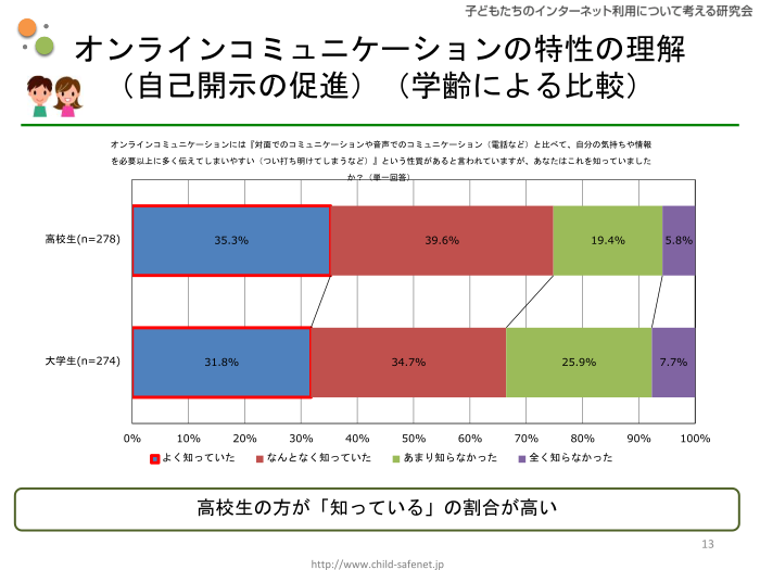また、「自己開示の促進」について学齢で比較すると大学生よりも高校生の方が「知っている」と回答する率が高い結果となりました。
